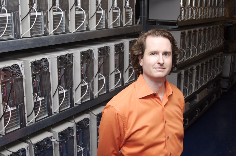 First Cluser - IdeeThis video provides the best overview of their services. Their first compute cluster was put together in less than a day (see photo to the left). Today their compute cluster includes over 300 processors and more than 40 terabytes of storage and it is continuing to grow (see glamour shot of Paul below).
